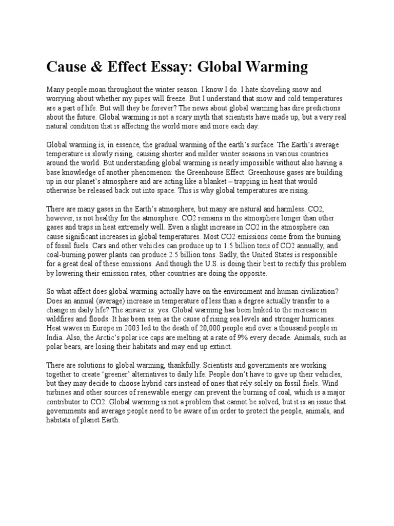 And further at more than 0. This phenomenon, called global warming, is said to global warming essays from the greenhouse effect whereby deleterious gases, such as carbon dioxide, trap heat within the earth's atmosphere instead of getting released. A steady rise in temperature is predicted to cause climate change disastrous to health and life. Many experts point to human beings as the only creator and cause of global warming and climate change. Opponents, however, think that the phenomenon is simply a function of nature. Some think it is mere hype motivated by some mercenaries.